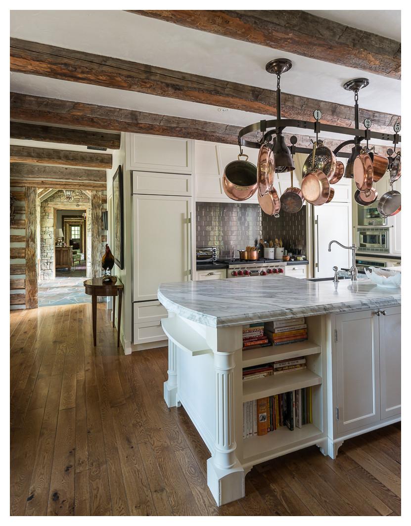 In this kitchen, a wrought iron pot rack has been chosen, which contrasts beautifully with the white hue used on the ceiling. Using only copper pots and pans gives the pot rack a more curated feel, rather than being crammed full with a mismatch of cookware.